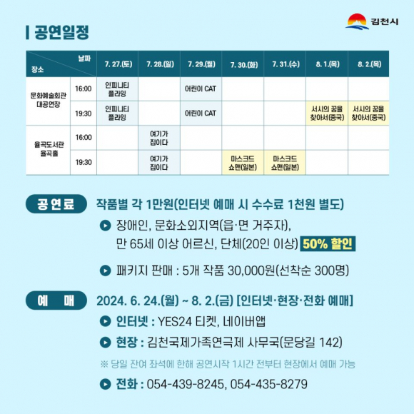 김천시는 “여름 휴가철 가족 모두 함께 즐길 수 있는 작품으로 구성한 만큼 가족과 함께 관람하시고 행복한 추억을 남길 수 있길 바라며, 앞으로도 김천시는 많은 이들이 문화예술을 즐길 수 있는 특별한 도시가 될 수 있도록 더욱 노력하겠다.”라고 말했다. |