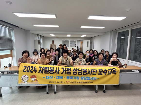 | 김천시종합자원봉사센터(센터장 김경희)에서는 6월 24일 대신, 대곡, 율곡동 3개 지역에서 운영되고 있는 거점상담봉사단 보수 교육을 자원봉사센터 교육실에서 30여 명이 참석한 가운데 실시하였다.