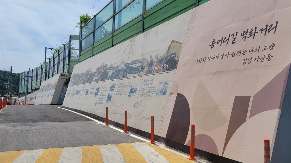 철길 옆 이 골목은 6.25 사변 등을 겪으며 자산동은 물론 김천시의 영광과 역사를 간직한 곳이며 이후 포장마차가 즐비했던 곳으로 서민의 정겨운 공간으로 지나왔으며 포장마차 철거 후에는 소외되고 노후화된 장소로 오랜 기간 역사의 뒤쪽으로 밀려나 있었던 장소였다. 낙후된 골목에 용머리길 역사에 관한 벽화를 그리고 굴다리길에는 패턴 벽화 작업을 해 어두운 거리에 활력을 주어 주민들의 큰 호응을 얻었으며, 인근에 거주하는 한 주민은 “이렇게 노후화된 벽면에 벽화를 그리고 나니 동네가 꽃밭이 된 것처럼 환해져서 너무 좋다.”라고 기쁨을 표했다. 이신기 자산동장은“앞으로도 자산동 행정복지센터에서는 노후화되고 소외된 지역을 지속해 살펴서 살기 좋고 아름다운 자산동으로 만드는 데 최선의 노력을 할 것임을 약속드린다.”라고 전했다. |