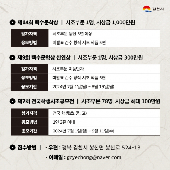 한국예총 김천지회(지회장 최복동)에서 주관하는 이번 문학제는 제9회 백수문학상, 백수문학상 신인상, 제7회 전국학생시조공모전 3개 부문으로 진행되며 △ 백수문학상은 시조부문 등단 5년 이상인 자의 미발표 순수 창작 시조 5편, △ 백수문학상 신인상은 시조부문 미등단자의 미발표 순수 창작 시조 작품 5편을 7월 1일부터 8월 19일까지 신청받으며 △ 전국학생시조공모전은 전국의 초, 중, 고등학생들의 시조 작품(1인 3편 이내)을 7월 1일부터 9월 11일까지 신청받는다.