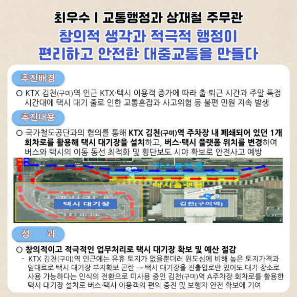 최우수에 선정된 교통행정과 상재철 주무관(공업7)은 KTX 김천(구미)역 주차장 내 폐쇄되어 있던 1개 회차로를 활용해 택시 대기장을 설치하고, 버스·택시 승강장 위치 변경으로 버스와 택시의 이동 동선 최적화, 횡단보도 시야 확보 등으로 예산 절감, 교통혼잡 해소, 안전사고 예방에 힘썼다는 평가를 받았다.
