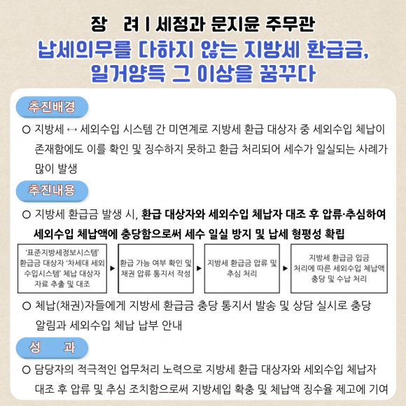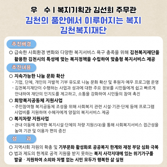 | 우수에 선정된 복지기획과 김선희 주무관(사회복지7)은 김천복지재단 기금을 활용한 복지 차량 지원사업, 김천형 긴급 지원사업 등을 실시하여 법과 제도의 한계로 공적 지원을 받지 못하는 복지시설·위기가구를 발굴·지원하여 소외와 차별 없는 시민 모두가 행복한 삶을 실현했다. 장려에 선정된 세정과 문지윤 주무관(행정9)은 지방세 환급금 발생 시, 지방세 환급 대상자와 세외수입 체납자 대조 후 압류 및 추심 처리함으로써 체납액 징수율 제고에 이바지했다.
