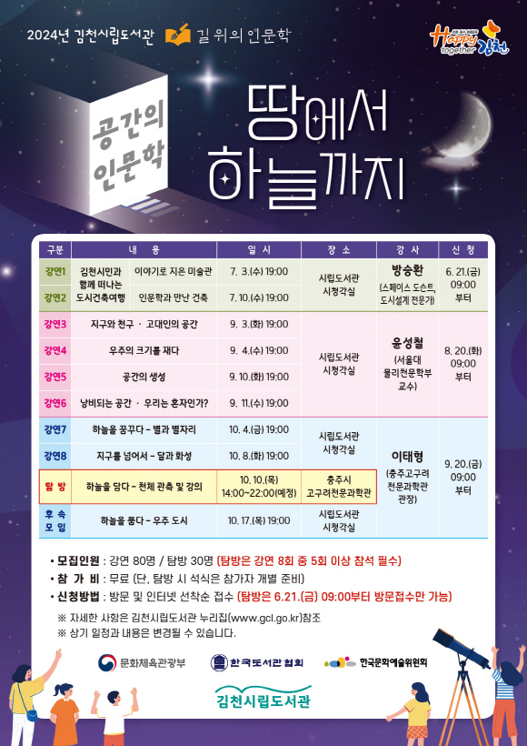| 김천시립도서관(관장 이순영)에서는 지난 7월 3일 문화체육관광부와 한국문화예술위원회가 공동주최한 공모사업 <2024년 길 위의 인문학 : 땅에서 하늘까지>를 80여 명의 시민들이 모인 가운데 성황리에 개강했다.