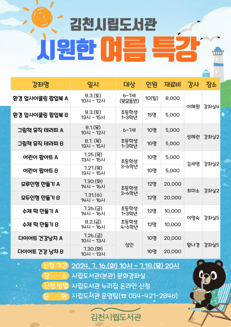 | 김천시립도서관(관장 이순영)은 무더운 여름을 맞아 시민들이 시원한 도서관에서 더위를 피하며 독서문화 및 여가 생활을 즐길 수 있도록, 본격적인 무더위가 시작되는 7월 25일부터 여름 특강을 운영한다.