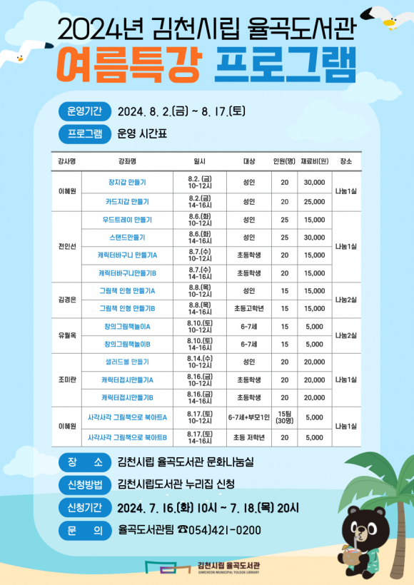 이순영 시립도서관장은 “무더운 여름을 맞아 시원한 도서관에서 어린이들과 가족들이 책과 독서를 즐기고, 새로운 경험과 여가를 즐기는 시간을 보내길 바란다.”라고 전했다.