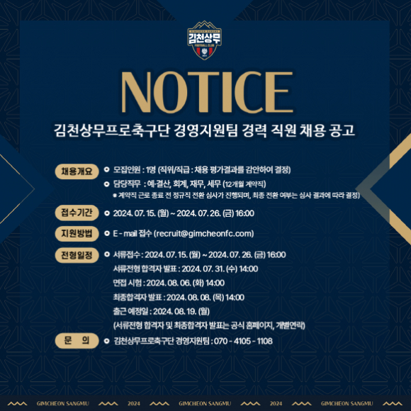 | 김천상무프로축구단(대표이사 배낙호)이 7월 15일 월요일부터 경영지원팀 직원을 채용한다. 채용 분야는 경영지원팀 대리급 1명이며, 예·결산, 회계, 재무, 세무 업무를 맡는다. 정규직 전환 여부는 12개월 근로계약 후 심사를 통해 결정된다.