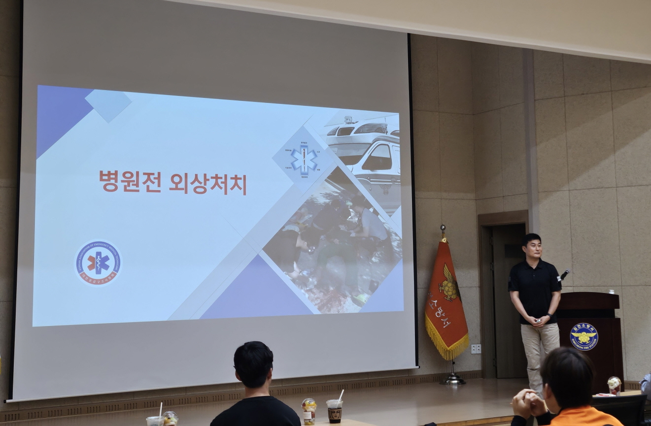 | 김천소방서(서장 안영호)에서는 지난 7월 12일 병원 전 외상소생술 전문 강사인 선린대학교 응급구조과 김수일 교수를 초빙하여 구급대원 대상으로 병원 전 외상처치술 교육을 실시했다.