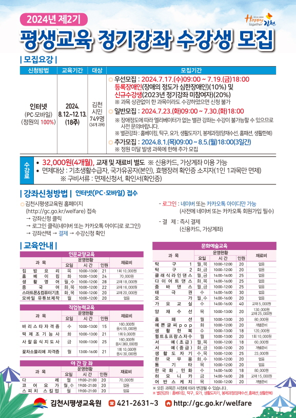 자세한 일정은 다음과 같다. - 우선모집 7월 17(수) ~ 7월 19일(금) : 장애인 및 신규 - 일반모집 7월 23(화) ~ 7월 30일(화) : 19세 이상 김천시민 - 추가모집 8월 1(목) ~ 8월 5일(월) : 정원 미달 과목 - 교육기간 8월 12일(월) ~ 12월 13일(금)