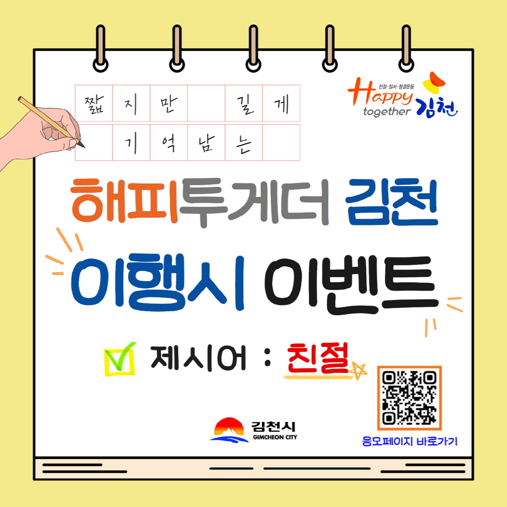 선진시민의식운동인 ‘Happy together 김천’운동에 대한 지속적인 관심과 참여를 위해 진행하는 이번 이벤트는 온라인을 통해 국민 누구나 쉽게 참여할 수 있다. 제시어는 ‘친절’로, ‘Happy together 김천’운동의 주요 실천과제 중 하나인 이 제시어로 짧은 이행시를 지어 응모페이지(https://naver.me/G38fTp6b)를 통해 참여하면 된다.