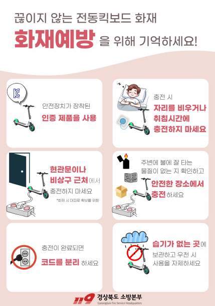 |  | | | ⓒ 김천내일신문 | | 김천소방서는 전동킥보드, 노트북, 휴대폰 등 무선배터리 사용 제품들이 늘어나면서 화재 위험성도 함께 증가하고 있어 관련 피해 최소화를 위한 화재예방 수칙을 홍보하고 있다.