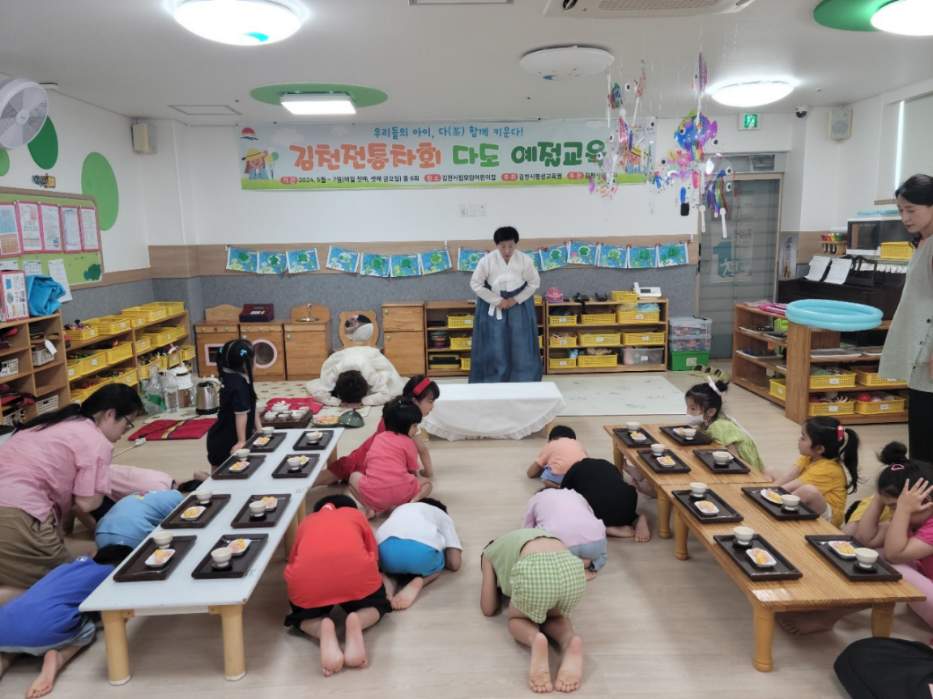 다도 예절교육은 김천시평생교육원이 주최하고 김천시전통차회가 주관해 관내 어린이집에서 다례에 대한 기본적인 개념과, 인사법, 차 마시는 법, 효경 등을 3개월간 교육했으며, 이날은 그동안 배운 과정을 종합해 원아들이 고사리 같은 손으로 직접 선생님께 차올리는 과정으로 마무리됐다.