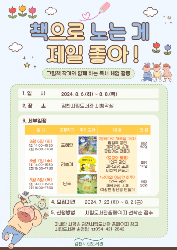 | 김천시립도서관(관장 이순영)은 여름방학을 맞아 무더운 여름을 시원하고 쾌적하게 보낼 수 있도록 관내 초등학교 저학년 어린이들을 대상으로 8월 6일부터 8월 8일까지 시립도서관에서 「책으로 노는 게 제일 좋아!」 프로그램을 운영한다.