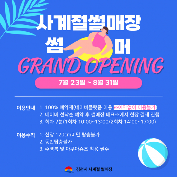 김천시 사계절 썰매장 하계시즌은 오는 7월 23일부터 8월 31일까지 진행될 계획이다. 매주 월요일은 휴장이며 기상여건에 따라 단축 또는 연장될 수 있다.