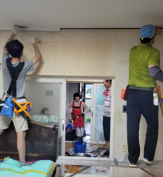도배봉사자들은 크고 작은 집기 수리와 각 방의 전구 교체는 물론 올 여름 장마기간 동안 혹여 붕괴 우려가 염려되어 집 안팎 곳곳을 둘러보고 노부부께 더운 여름 건강하게 보내시라는 인사말을 남기고 일정을 마무리 하였다.