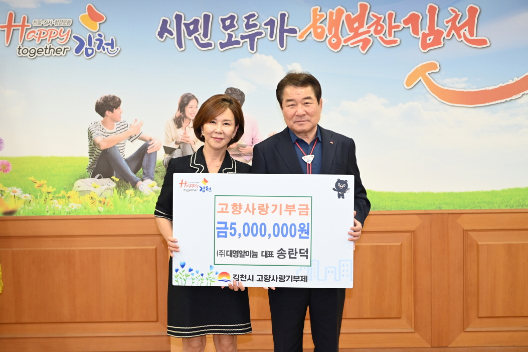 | 김천시는 ㈜대영알미늄 송란덕 대표가 고향사랑기부금 최고 한도액 500만 원을 지난해에 이어 올해도 기탁하며 김천시를 응원했다고 7월 23일 밝혔다.