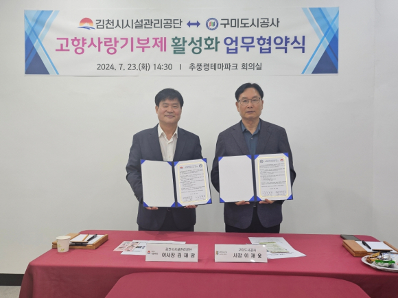 | 김천시 시설관리공단(이사장 김재광)은 고향사랑기부제 활성화를 위해 작년(23년도) 문경관광진흥공단에 이어 지난 23일 구미도시공사와 2024년 고향사랑기부제 업무협약을 체결했다고 밝혔다.