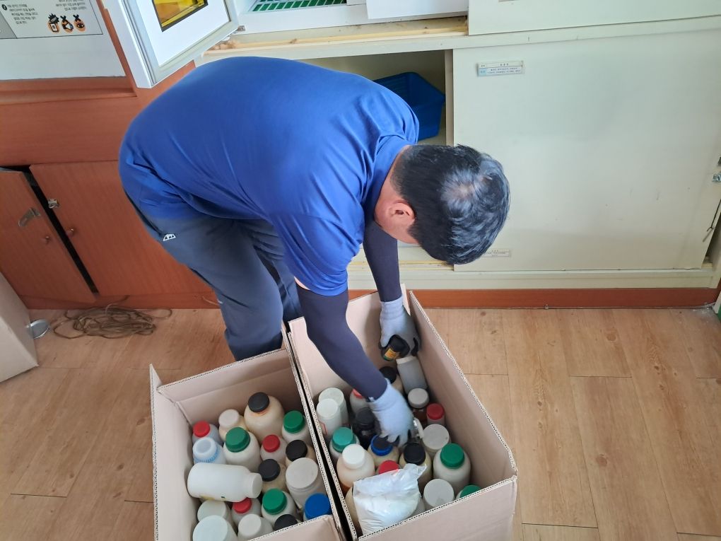 | 경상북도김천교육지원청(교육장 공현주) 학교지원센터에서는 7월 22일, 23일 양일간 과학실 담당 교원의 업무 경감과 안전한 과학실 환경 조성을 위하여 관내 초.중.고 23개 학교의 과학실에 보관 중인 폐시약 및 폐수를 수거하였다.