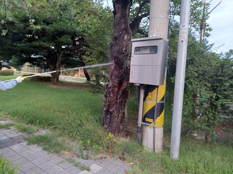 | 김천시는 7월의 고온, 건조한 날씨가 지속되면서 벚나무사향하늘소 및 갈색 무늬 구멍병 등 병해충 피해가 급증함에 따라, 방제 작업에 총력을 다하고 있다. 벚나무사향하늘소 성충은 7~8월 벚나무 등에 기생하며 8월 말쯤 알 부화 후 이듬해 9월까지 나무껍질 아래 형성층 부위만 피해를 주다가 9~10월부터 월동하기 위해 나무껍질을 뚫고 들어가기 때문에 방제하기 매우 어려운 해충에 속한다.