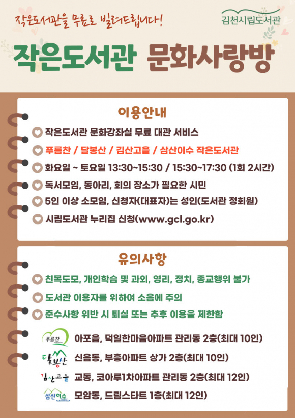 신청할 수 있는 작은도서관은 푸름찬(아포읍, 덕일한마음아파트 관리동 2층), 달봉산(신음동, 부흥아파트 상가 2층), 김산고을(교동, 코아루1차아파트 관리동 2층), 삼산이수(모암동, 드림스타트 1층) 4개소이며, 지역 주민들의 독서 모임·동아리 활동·회의나 소모임 등 다양한 목적으로 이용할 수 있다.