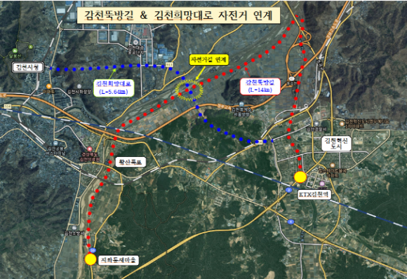 이에 김천시에서는 감천뚝방 자전거도로와 김천 희망대로 자전거도로 간 단절됐던 구간 연계를 통해 자전거도로의 연속성을 확보하고 이용자들에게 더 안전하고 쾌적한 라이딩 환경과 감천변의 아름다운 자연경관을 함께 즐기는 라이딩 명소를 제공하여, 자전거 동호인들과 시민들의 인기를 끌고 있다.