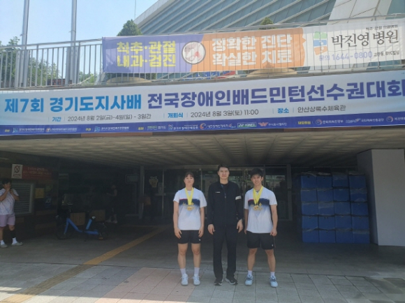 |  | | | ⓒ 김천내일신문 | | 김천시청 배드민턴단의 서명수, 박민경 선수가 지난 8월2일부터 4일까지 3일간 안산상록수체육관에서 펼쳐진 「제7회 경기도지사배 전국장애인배드민턴대회」에서 단식(남, 여)과 혼합복식에서 금메달 3개를 획득하며 정상을 차지했다.