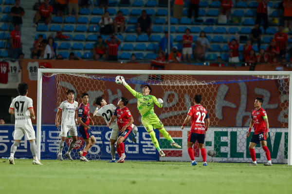 선제골은 김천상무의 몫이었다. 전반 35분, 오른쪽 측면에서 롱패스를 받은 김대원이 공격적인 터치로 단숨에 강원의 문전 앞으로 진입했다. 이어 낮고 빠른 ‘크로슛’을 시도했고, 이 공이 상대 수비수의 발에 맞고 골문으로 빨려 들어가며 김천상무가 1대 0으로 앞서갔다.