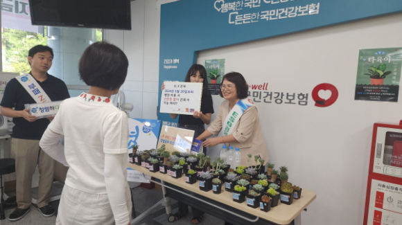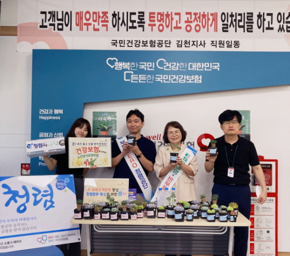 |  | | | ⓒ 김천내일신문 | | 국민건강보험공단 김천지사(지사장 민명자)는 지난 8월12일과 13일 종합민원실 방문고객 대상 ‘청렴하다62(청렴하다육이)’이벤트 행사를 실시하여 좋은 호응을 받았다고 밝혔다. 이날 행사는 무더운 날씨로 지친 방문고객에게 심리적 안정감을 제공하고 고객만족 실천과 청렴 공단 이미지 구축을 위한 행사로 다육이 화분에 청렴문구가 새겨진 스티커와 팻말을 직접 만들어 부착하여 일상 속에서 개인의 청렴 실천 의지를 되새기고자 마련했다. 지사 방문고객에게 국가암검진, 특사경, 담배소송 등에 관한 퀴즈를 풀고 정답자에게 청렴 문구와 고객만족 실천 의지를 새긴 62개의 다육이와 시원한 얼음생수를 선물로 전달했다. 율곡동에 거주하는 이00(40세)는 “‘퀴즈 풀고 선물 받고 건강보험 알리고’이벤트에 참여해서 직원들이 직접 정성스럽게 준비한 반려식물과 얼음생수에 감동 받았다. 처음 길러보는 다육이가 맑고 상쾌하게 만들어 무더위를 날려 버리는 큰 힘이 될 것 같다”고 말했다.
