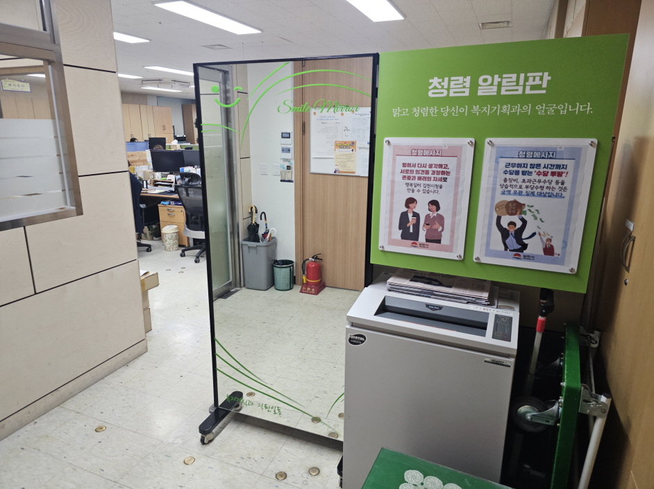 입구에 배치된‘스마일 청렴 거울’을 통해 거울에 비친 자신을 보며 옷매무시를 단정히 하고, 공직자의 표정과 행동이 김천시의 얼굴임을 인식하여 직원들이 더 친절하고 책임감 있게 업무를 수행하게끔 유도할 계획이다.