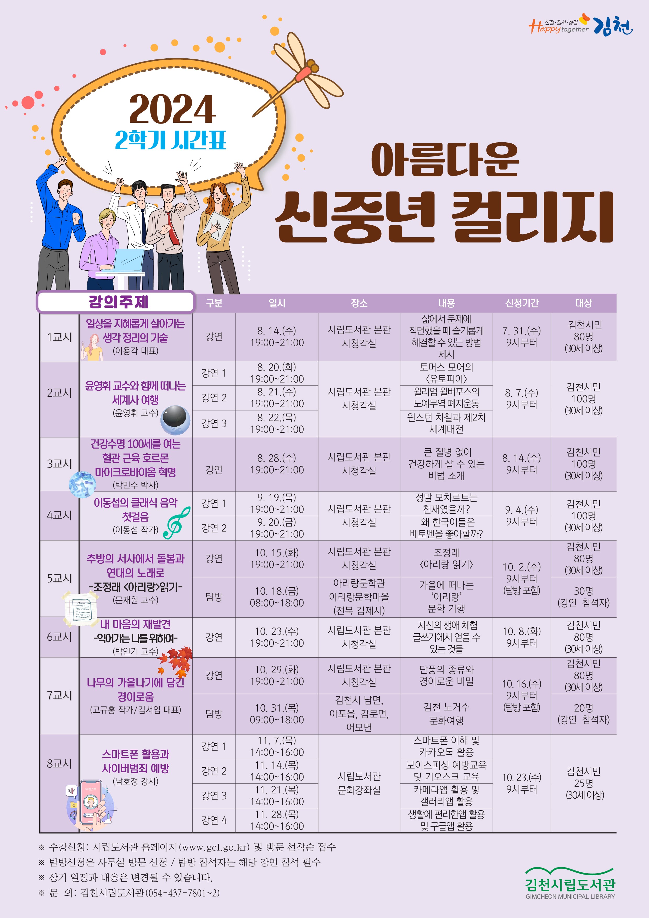 | 김천시립도서관(관장 이순영)은 중장년층 지역주민을 대상으로 기획한 인문 교양 프로그램인 <아름다운 신중년 컬리지 2학기 3교시> 참가자를 모집한다고 밝혔다.