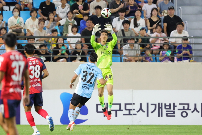 □ ‘프로 첫 출전’ 정명제-‘친정 상대’ 김강산 안정적인 활약 경기의 초반 주도권을 가져간 팀은 김천상무였다. 김천상무는 양쪽 측면 공격수로 나선 김대원과 이동준의 빠른 속도를 활용해 대구를 공략했다. 유강현도 전방에만 머무르지 않고 경기장을 넓게 쓰며 연계 플레이에 주력했다. 기세를 몰아 경기 초반에만 네 차례 슈팅을 날리며 대구 골문을 위협했다.