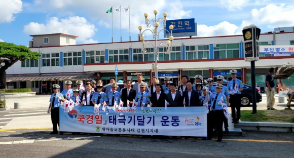 이날 김천역에서 펼쳐진 캠페인에는 김충섭 시장, 나영민 시의장을 비롯한 여러 시의원과 이우청 도의원이 함께 참석해, 택시와 오가는 차량에 일일이 태극기를 달아주고 일부 시민에게는 손태극기를 나눠주는 등, 광복절과 그날의 의미를 잊지 말고 국경일 태극기 달기를 당부했으며, 무더운 날씨에도 열정적으로 활동하고 있는 교통봉사대원들을 격려했다.