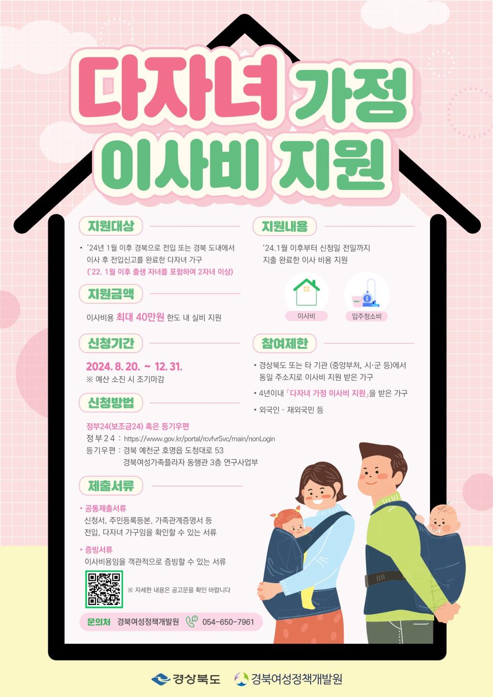 | 경상북도가 저출생 문제에 적극 대응하고, 다자녀 가정의 주거 안정을 위해 ‘다자녀 가정 이사비 지원’ 사업을 8월 20일부터 추진한다.