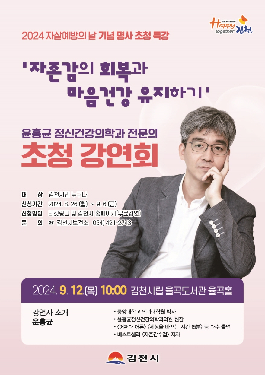 | 김천시(시장 김충섭)는 ‘자살예방의 날(9.10.)’을 맞아 오는 9월 12일 율곡시립도서관에서 윤홍균 정신건강의학과전문의를 초청해 명사특강을 개최한다.