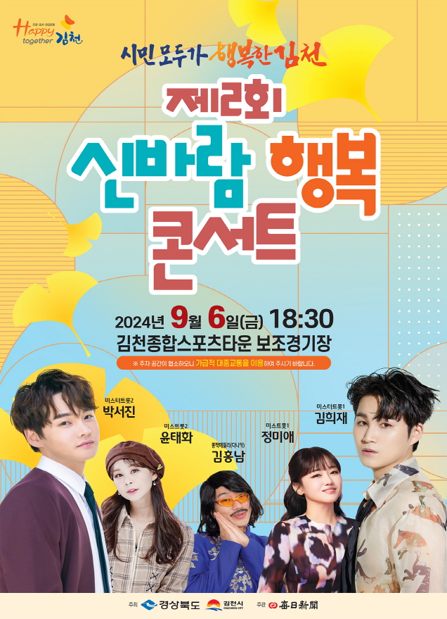 | 김천시(시장 김충섭)는 「제2회 신바람 행복 콘서트」를 9월 6일, 김천종합스포츠타운 보조경기장에서 개최한다고 밝혔다.
