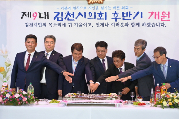 나영민 의장은 오늘 행사를 통해 “새롭게 출발하는 후반기 김천시의회는 ‘기본과 원칙으로 시민을 섬기는 바른 의회’를 목표로 의회 본연의 기능에 충실하고, 시민들의 기대에 부응하고자 더욱 낮은 자세로 성실히 의정활동에 임하겠다.”라고 포부를 밝혔다. |  | | | ⓒ 김천내일신문 | |