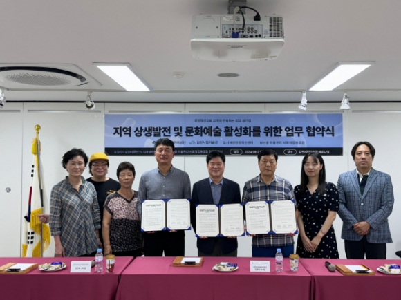 해당 업무협약은 김천시립미술관에서 진행되었으며 김천시시설관리공단 김재광 이사장, 김천시 남산지구 도시재생현장지원센터 김언호 센터장과 남산골 마을관리 사회적협동조합 강경규 이사장을 포함하여 9명이 참석했다. 행사는 기념사, 업무협약 체결, 기념 촬영 순으로 진행되었다. 이번 협약을 통해 세 개 기관에서는 남산지구 도시재생사업의 상생발전 및 문화예술 활성화를 위해 △ 9월 초부터 김천시립미술관에서 지역 어린이 교육프로그램 시행 △ 10월에는 제2회 과하천 축제 등을 함께 진행할 예정이다.