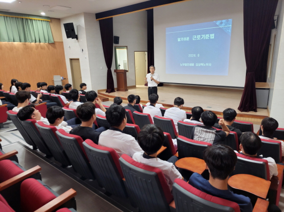 | 김천시 노사민정협의회 사무국이 지난 8월 23일 김천생명과학고등학교 취업준비생을 대상으로‘취약 근로자 노동권 및 안전보건 인식개선 교육'을 시행했다.