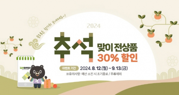 김천시는 다가오는 추석 명절을 맞이하여 소비자들에게는 추석 선물에 대한 가격 측면에서 부담감을 줄여줌과 동시에 우리 시 농특산물에 대한 홍보 및 농가의 소득증대를 위하여 김천팜앤장터 내 모든 품목(제외 신청한 업체와 주류 제외)에 30% 할인을 진행하며 추가 할인을 진행하는 업체가 있을 시 더욱 저렴한 가격에 다양한 우리 시 우수 농특산물을 맛볼 수 있을 것으로 전망된다. (다만 준비된 물량이 소진되면 할인행사가 조기 종료될 수 있다)