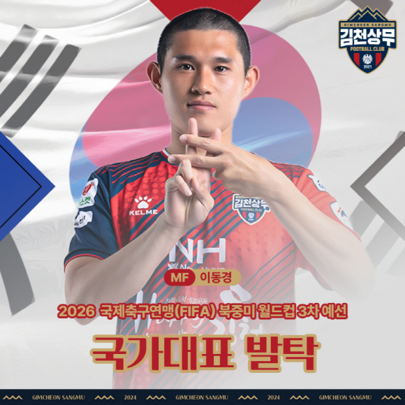 | 김천상무프로축구단(대표이사 배낙호, 국군체육부대장 진규상)의 이동경이 ‘2026 FIFA 북중미 월드컵 아시아지역 3차 예선’ 두 경기에 나서는 A대표팀에 승선했다. 이동경은 대표팀 발탁에 대해 “1년 만에 대표팀에 소집되었다. 영광스러운 자리에 올라 기쁘고, 좋은 모습을 보일 수 있도록 잘 준비하겠다.”라며 소감을 전했다.