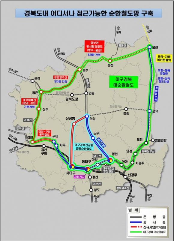 대구경북대순환철도망은 올해 개통예정인 ▴동해중부선(포항~울진), 기본계획 수립 중인 ▴중부내륙선(문경~김천)과 현재 운영 중인 ▴동해남부선(포항~경주), 중앙선(영천~경주), ▴대구선(동대구~영천), ▴경부선(동대구~김천), ▴점촌~영주선, 미연결 구간인 ▴분천~울진 구간을 연결할 작정이다.