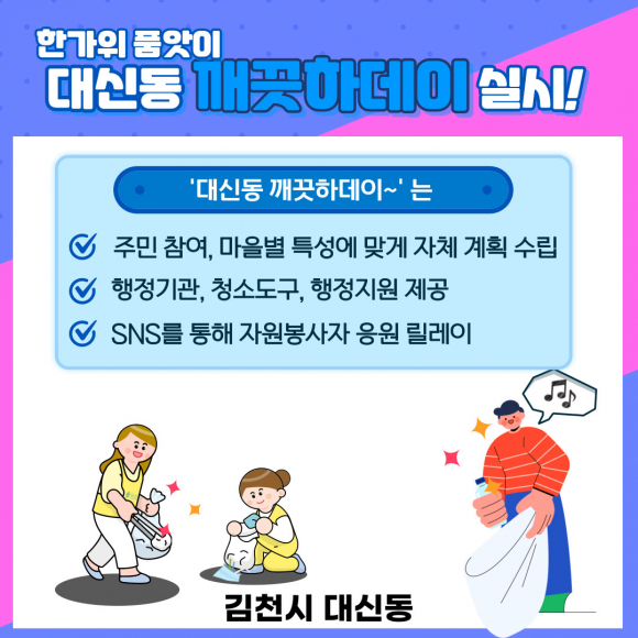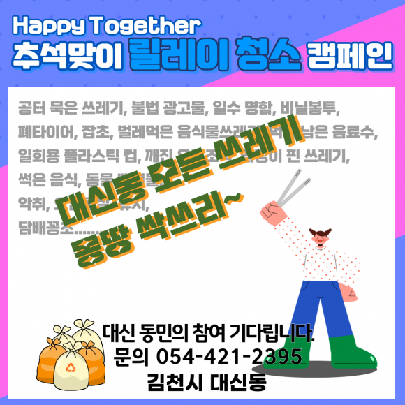 | 김천시 대신동(동장 이해정)은 다가오는 추석 명절을 맞아 깨끗하고 쾌적한 마을 환경 조성을 위해 '추석맞이 릴레이 청소 캠페인 (대신동 깨끗하데이~)'를 실시한다.