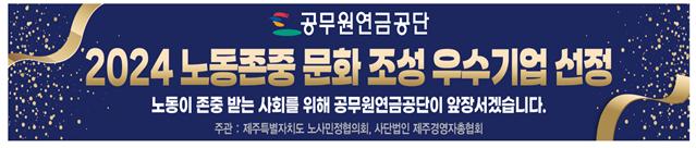 | 공무원연금공단(이사장 김동극)이 지난 8월 28일 제주특별자치도 노사민정협의회와 사단법인 제주경영자총협회에서 주관하는 ‘2024 노동존중 문화 조성 우수기업’으로 선정되었다고 밝혔다.