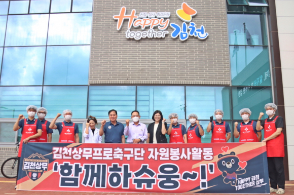 | 김천상무프로축구단(대표이사 배낙호)이 8월 29일, 김천장애인회관을 방문에 급식 자원봉사활동을 진행했다. 이날 김천상무의 사무국 임직원은 김천시 응명동에 위치한 김천장애인회관을 방문해 식자재 손질, 배식 등을 도왔다.