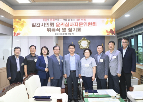 |  | | | ⓒ 김천내일신문 | | 김천시의회 (의장 나영민)는 8월 29일 의장 집무실에서 윤리심사자문위원회 위촉식을 개최하고 민간전문가 7명에게 위촉장을 수여했다. 시의회는 학계, 언론계, 시민사회단체 등 윤리·청렴 분야에서 높은 식견과 전문성을 갖춘 민간인으로 위원을 위촉하였으며,이후 열린 회의에서 마숙자 前김천교육지원청 교육장을 위원장으로 선출하고 자문위원의 역할․운영 전반에 대해 논의했다.