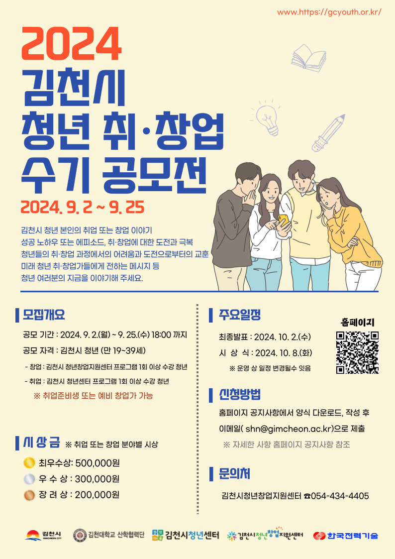 | 김천대학교(총장 윤옥현) 산학협력단(단장 김용준)에서는 김천시 청년들의 취업과 창업 이야기를 듣고자 『김천시 청년 취·창업 수기 공모전』을 개최한다고 8월 30일 밝혔다. 이번 공모전은 김천시가 주최하고 김천대학교 산학협력단, 김천시 청년(창업지원)센터가 주관, 한국전력기술(주)이 후원하였다.