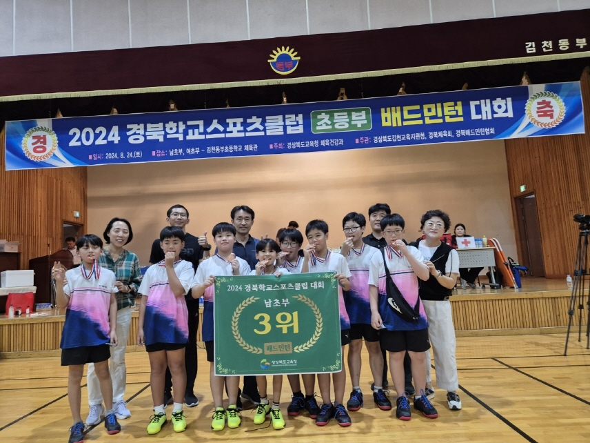 | 김천시 감천초등학교(교장 김명규)는 지난 9월 24일 김천동부초등학교에서 열린 경북도교육청 주최 ‘2024 경북스포츠클럽 배드민턴(초등부) 대회에서 3위를 차지하는 쾌거를 이뤘다.