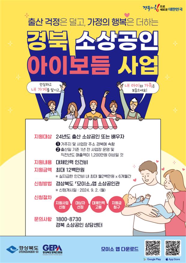|  | | | ⓒ 김천내일신문 | | 경상북도는 ‘2024년도 소상공인 출산지원 아이보듬지원사업’의 참여 대상자 신청 접수를 9월2일부터 시작한다.