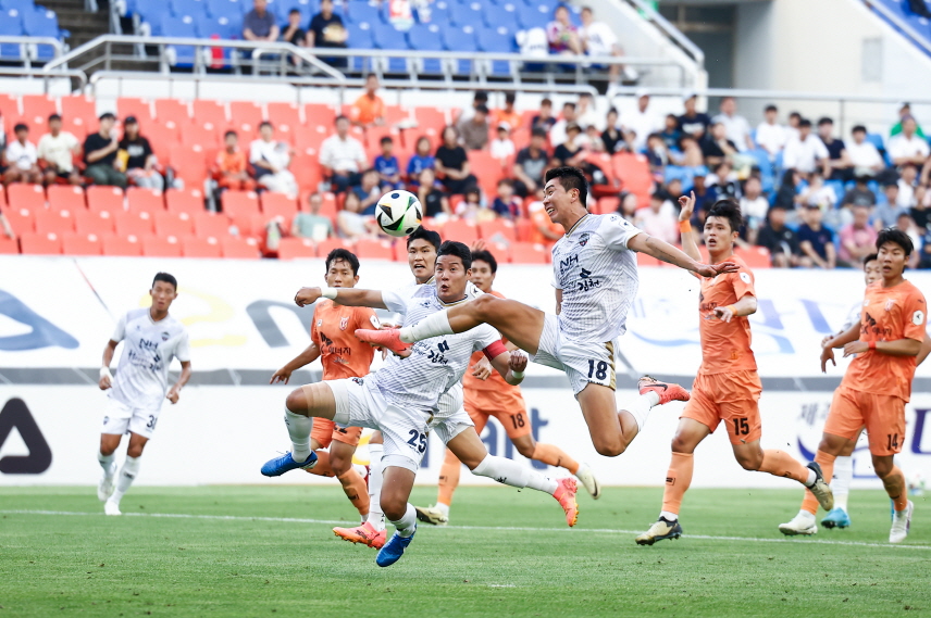 김천상무는 3연속 무승 탈출을 위해 초반부터 제주를 거세게 압박했다. 원정석에도 100여 명의 팬이 경기장을 찾아 승리를 위해 목소리를 높였다. 전반 13분, 결정적인 찬스가 찾아왔다. 제주 진영에서 이동경이 올린 프리킥을 유강현이 슈팅으로 연결했지만, 골키퍼 선방에 막혔다. 흘러나온 공을 모재현이 올렸고 재자 유강현이 슈팅을 때렸지만, 이번에도 골키퍼 선방에 막히며 아쉬움을 삼켰다.