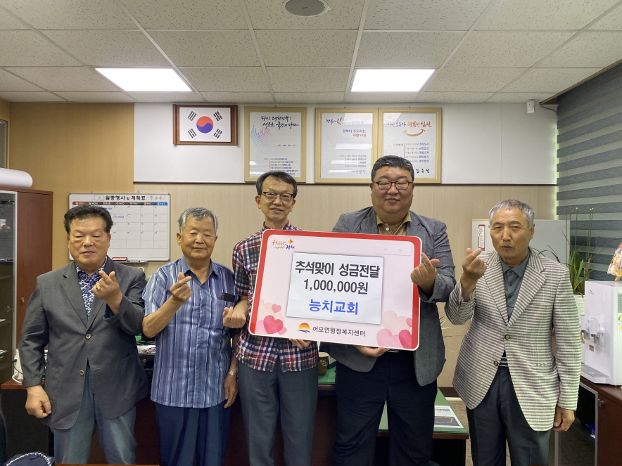 | 능치교회는 9월 2일 추석을 맞이하여 어모면 행정복지센터를 방문하여 저소득층 및 복지 사각지대를 위한 성금 100만 원을 김천복지재단에 전달했다. 능치교회는 매년 소외된 사회취약계층을 위해 성금을 전달하는 등 이웃사랑을 실천하며 꾸준히 지역사회 공헌에 앞장서 오고 있다.