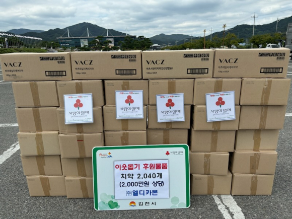 | 김천시(시장 김충섭)는 지난 9월 3일 (주)엘디카본(대표이사 황용경)으로부터 치약 34상자(2,000만 원 상당)를 전달받았다고 밝혔다.